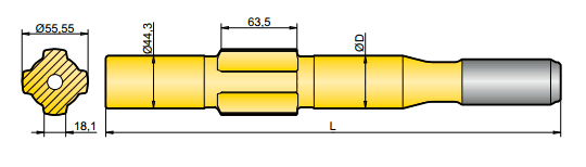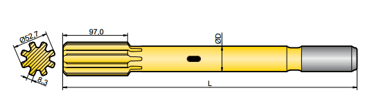 釬尾用于轉移鉆機和鉆桿的能量,一端連接于鉆機,一端連接于鉆桿,因此鉆機的能量就得以傳送到鉆頭,并最終達到掘進的目的。